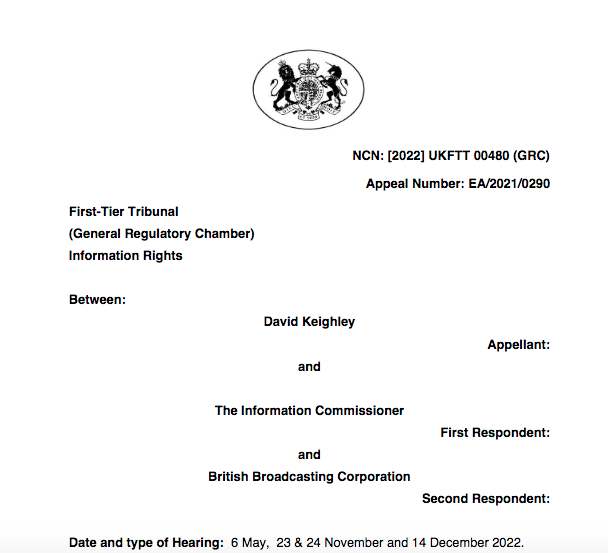 See FTT Appeal Number: EA/2022/0376 BBC v ICO & William Turvill at: https://informationrights.decisions.tribunals.gov.uk/DBFiles/Decision/i3223/BBC%20v%20ICO%20&%20William%20Turvill%20-%20EA.2022.0376%20-%20Decision.pdf