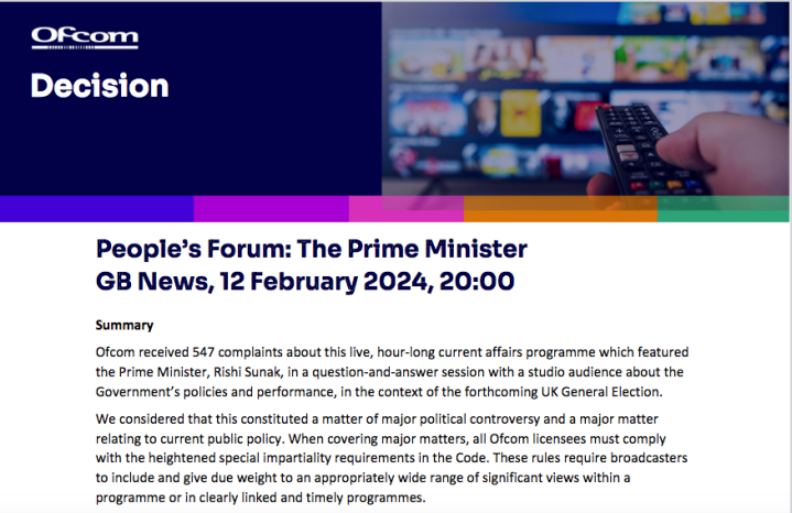 The strengthened guidance on due impartiality follows recent decisions on complaints- the most high profile released on 20th May 2024 relating to GB News in bulletin number 498 relating to ‘The People’s Forum: The Prime Minister’, broadcast 12th February 2024.